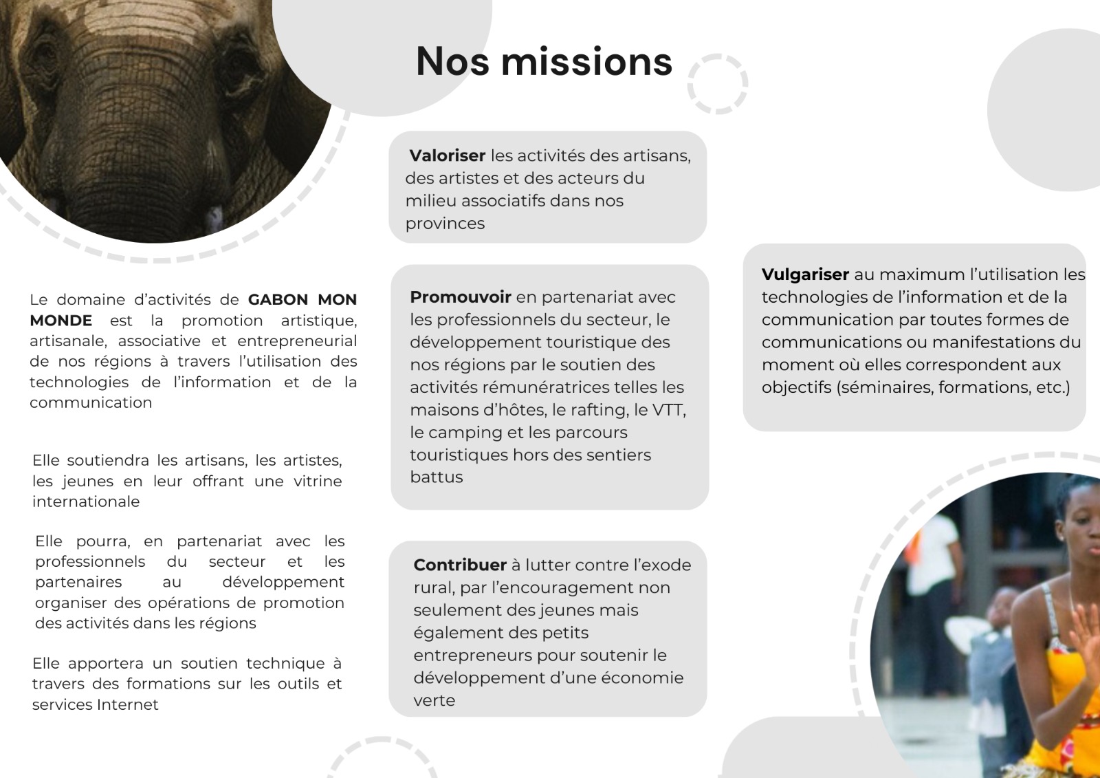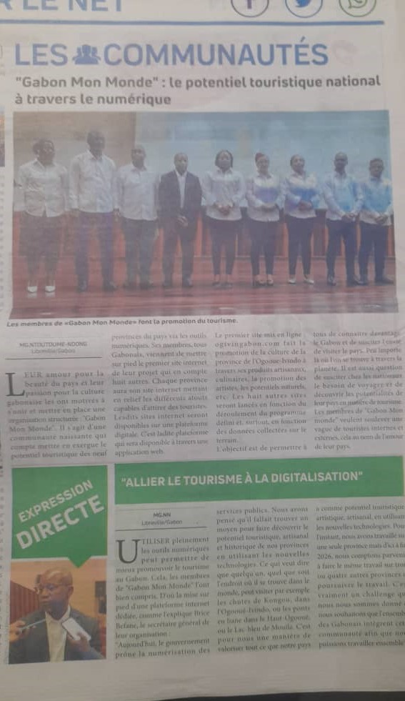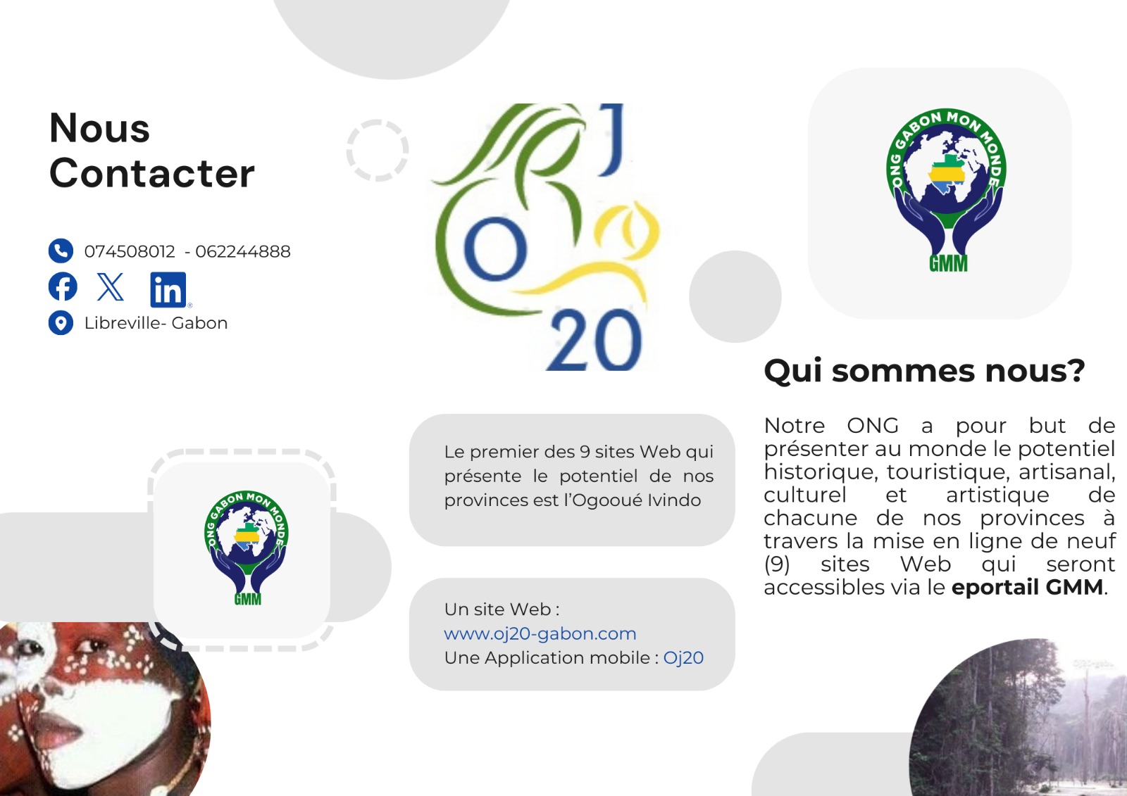 GMM est une organisation non gouvernementale qui a pour vocation la valorisation du patrimoine culturel, artistique, artisanal, touristique et historique des provinces du Gabon par l’utilisation des technologies de l’information et de la communication. A ce titre, GMM est entrain de mettre en place un portail numérique qui permettra d’accéder à 9 sites Web, présentant les spécificités évoquées précédemment de chacune des provinces. Lors de cette cérémonie, outre la prestation des artistes NKZ, Olive et Alain MEMIAGHE, l’équipe manageuriale de L’ONG a été présentée à l’auditoire. La cérémonie s’est terminée avec la présentation du site : www.oj20-gabon.org